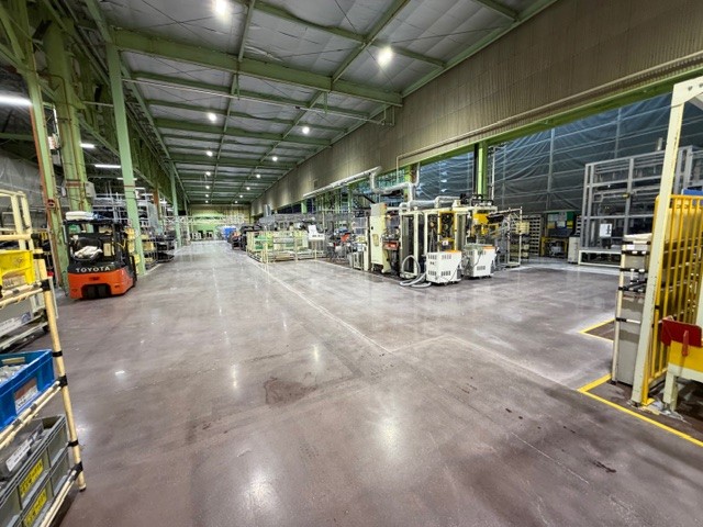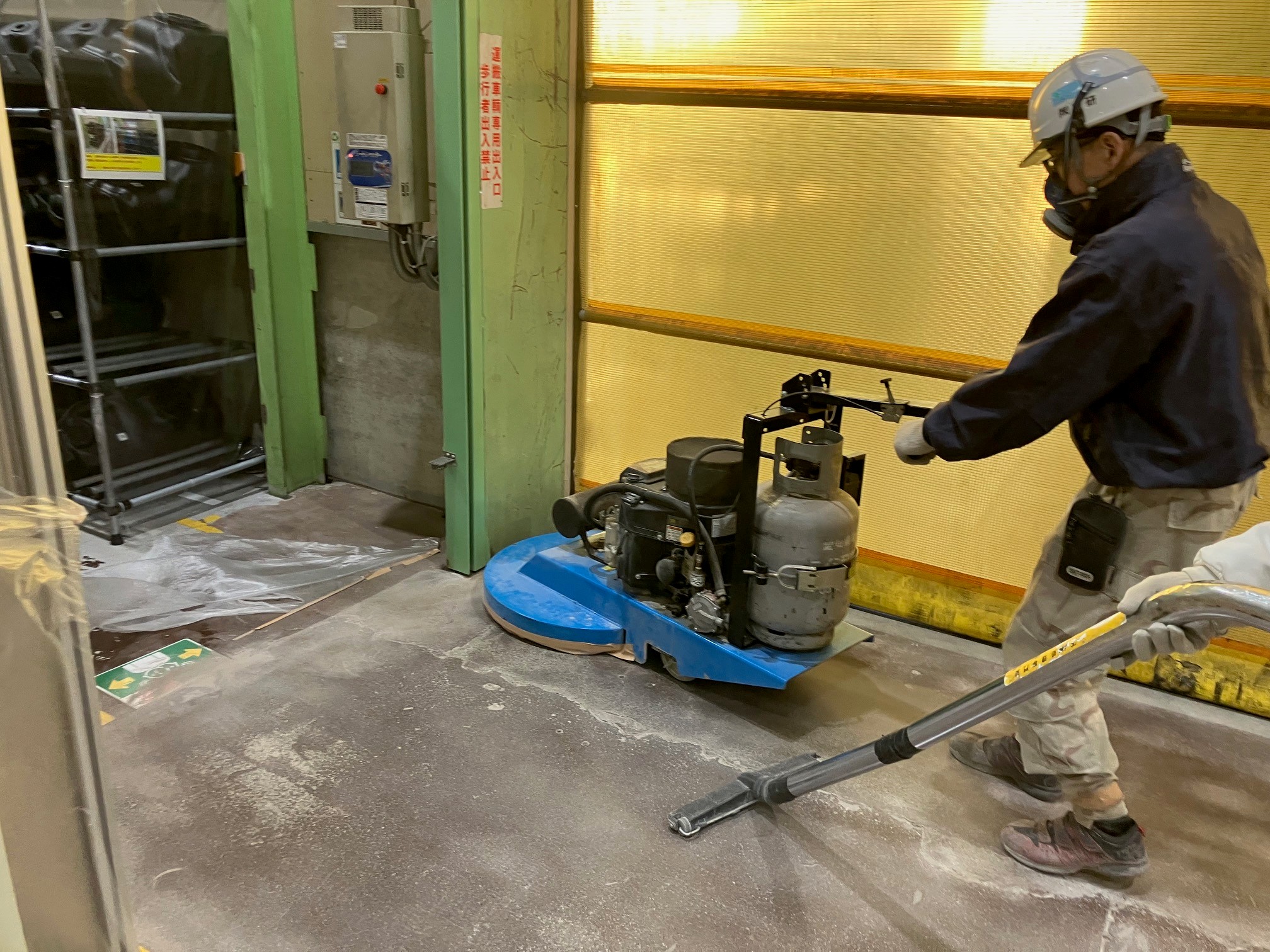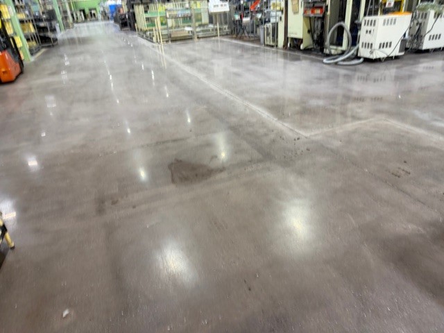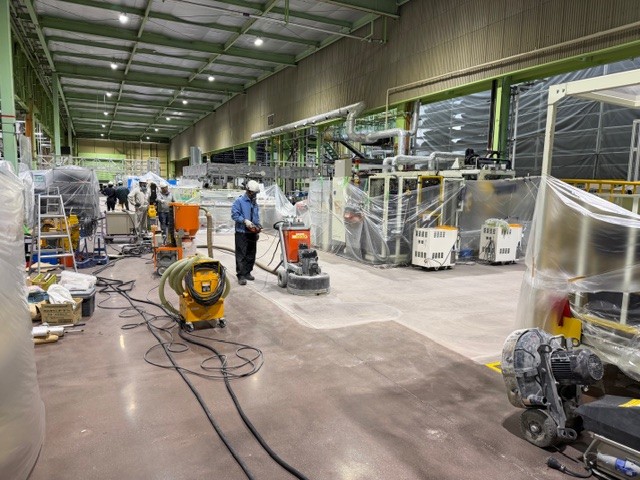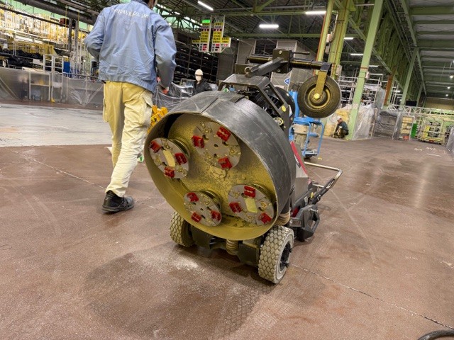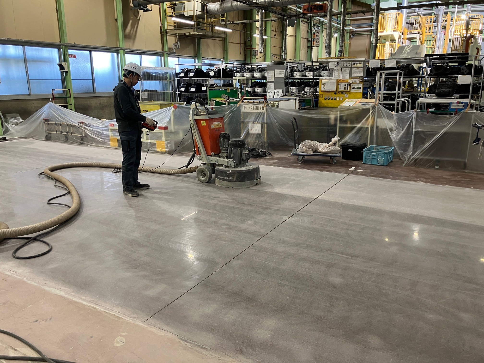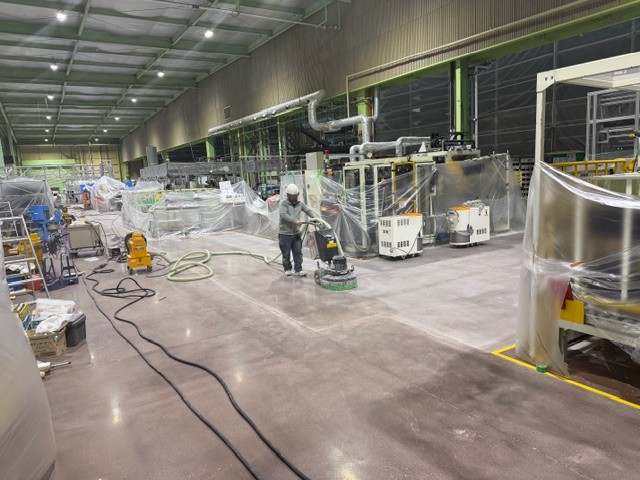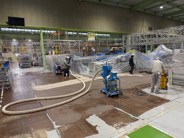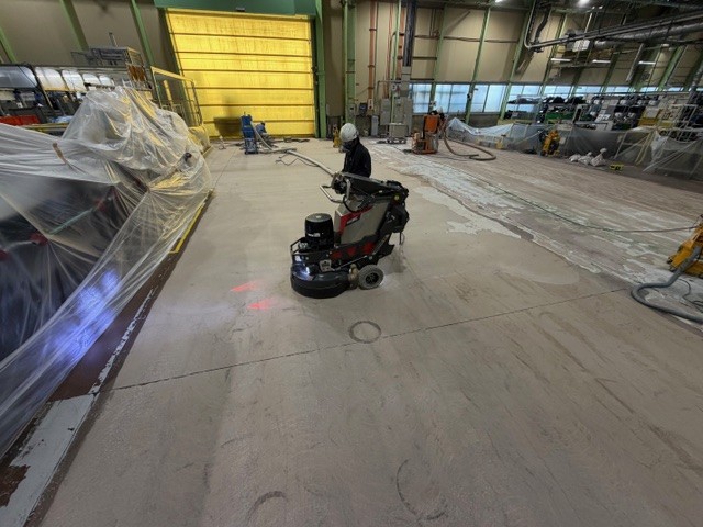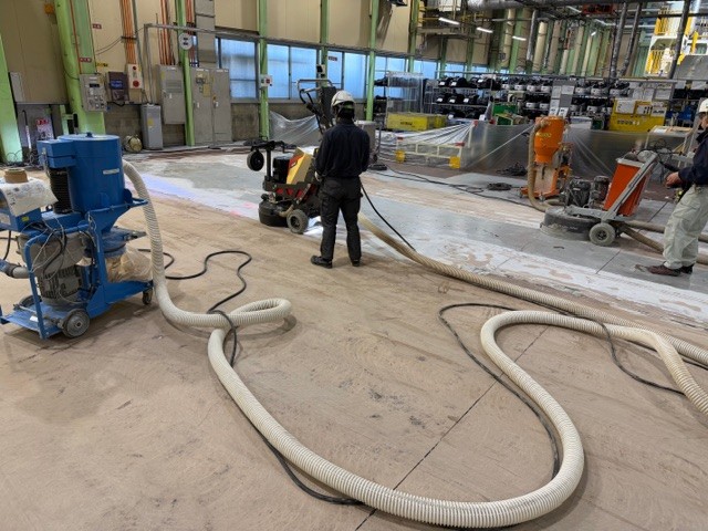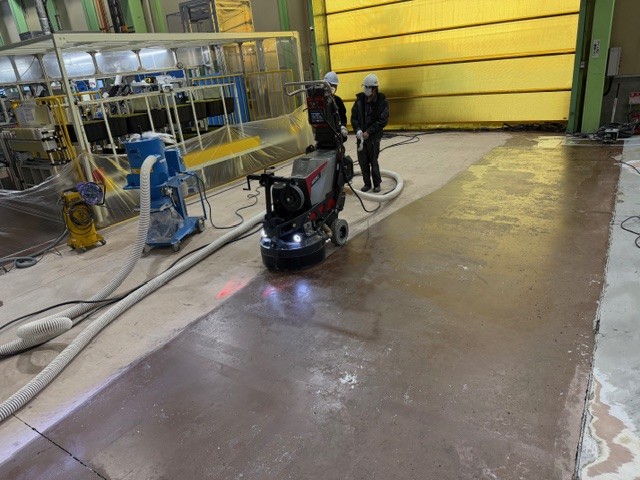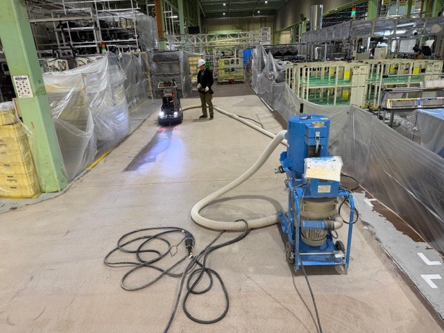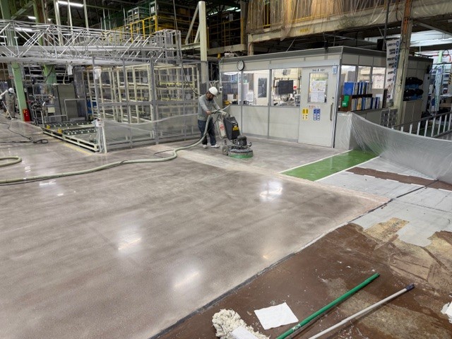 工場内の既存エポキシ塗床を撤去し、コンクリート本来の強度と美観を引き出すため、段階的に研磨・仕上げを行いました。